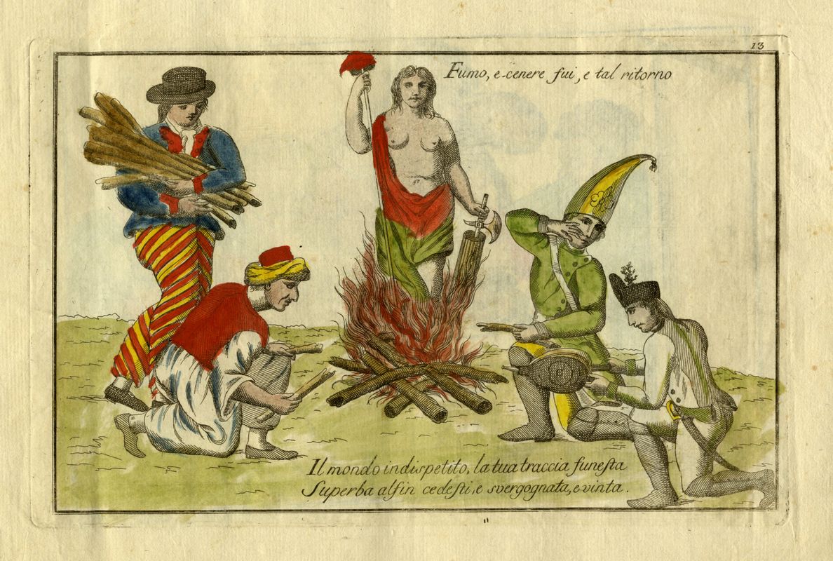Acquaforte in coloritura. mm 140/156x210/223. Foglio: mm 210x288/293. Tredici tavole, numerate in alto a destra da 1 a 13, sul tema della libertà e della democrazia, andate perdute con l'avvento di Napoleone. Nella composizione motti e distici in rima, alcuni in dialetto veneto. Alcune incisioni trovano il loro corrispondente, con alcune lievi differenze, in altrettante conservate in album miscellaneo proveniente dalla collezione Rothschild (inv. L 488, Musée du Louvre, Département des Arts graphiques) attribuite ad anonimo francese anche se con lettera in italiano. Ottime impressioni su carta vergellata sottile con filigrala "iscrizione"