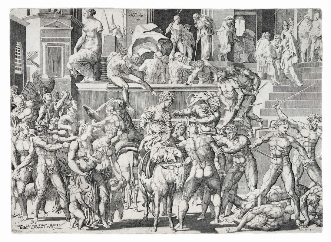 Bulino. mm 362x502. Bartsch, XV, 63. In alto al centro sul pilastro il titolo "Raptus Sabinaro", in basso a sinistra "Romule militibus seisti / dare conmoda tuis", e in basso a destra "Ant. Sal. exc.". La lastra è frutto di una collaborazione tra Rosso e Caraglio, lasciata incompiuta con il Sacco di Roma viene ritenuta l'ultimo lavoro del Caraglio, anche se venne completata da un incisore anonimo, dallo stile più duro e ampio. Bartsch riporta che l'invenzione è da attribuire a Baccio Bandinelli; Vasari invece l'attribuiva correttamente a Rosso Fiorentino. Quanto al soggetto, quello rappresentato non sarebbe il ratto vero e proprio, piuttosto un episodio successivo raccontato da Livio e da Plutarco, ovvero il tentativo di riscatto dei Sabini che raggiunsero Roma e combatterono nel Foro, mentre le donne Sabine intervennero per chiedere il mantenimento della pace. La figura femminile raffigurata seduta su un asino sarebbe la dea Vesta, presso il cui tempio avvenne la lotta. Ottima prova nello stato definitivo dopo il completamento della lastra, su carta vergellata con filigrana "scala a pioli in cerchio singolo sormontato da stella a sei punte" (Woodward, 239 - Roma, Antonio Salamanca, 1548). Bibliografia: Eugene Carroll, Rosso Fiorentino, NG Washington 1987, cat. 47.