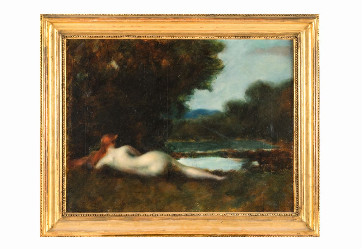Olio su tela. cm 50,5x63. Non firmato ma ascrivibile per qualità a Jean-Jacques- Henner, il dipinto presenta una versione molto simile a quella conservata al Musée Jean-Jacques Henner di Parigi col titolo Rêve ou la nymphe endormie (circa 1896-1900). Il soggetto appare replicato più volte con varianti, un'altra sempre allo stesso museo parigino (Figure couchée; Rêverie) (cfr. cat. Musée national Jean-Jacques Henner, a cura di I. de Lannoy, 1990, n. 323) e ancora una al Musée d'Art moderne du Havre, Normandie (Nu couché de dos). Altre versioni infine sono state aggiudicate nelle aste internazionali nel corso degli anni.