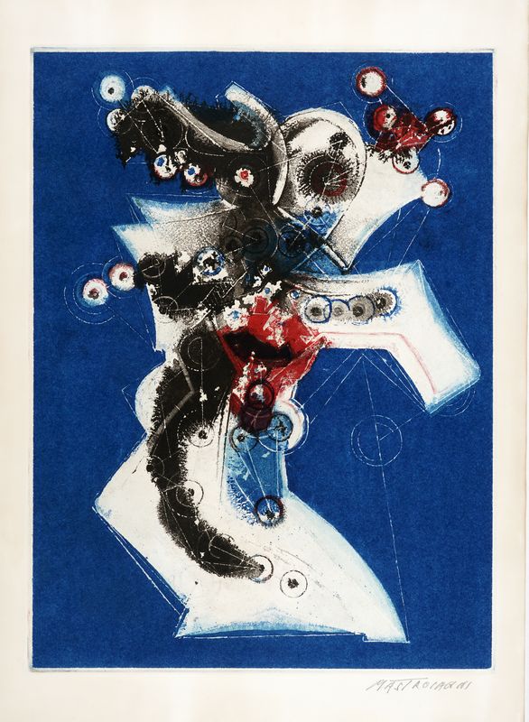 Monotipo. mm 580x435. Foglio: mm 700x500. Firma a matita in basso a destra. SI AGGIUNGE: 2) Dissonanza. Monotipo. mm 500x480. Foglio: mm 780x600. Firma a matita in basso a destra. Timbro a secco "gg edizioni e stampe d'arte" in basso a destra.