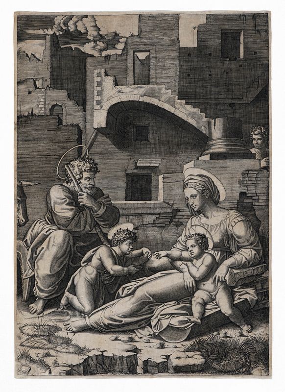 Bulino. mm 388x273. Bartsch,XIV,57. Shoemaker, 59. Raphael invenit (Madonne), XXXVIII, p. 207, 1. Soggetto in relazione a disegni eseguiti da Raffaello tra il 1518 e il 1519 sul tema della Sacra Famiglia, e forse uno degli ultimi lavori di Marcantonio sotto la guida del maestro. Ottima impressione riccamente inchiostrata nell'unico stato censito, su carta vergellata con filigrana "ancora con anello in cerchio singolo" (Briquet, 460 / Venezia, 1472/1490). In basso al verso a penna e inchiostro bruno nota di possesso di Johann Sigmund Bermann (Oesdorf, 1794-Vienna, 1846) mercante di stampe a Vienna (Lugt, 235).