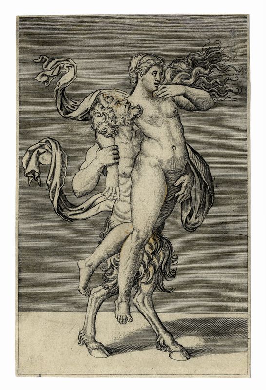 Bulino. mm 195x126. Bartsch, 300. Incisione già attribuita a Marco Dente da Ravenna. Bellissima impressione nel I stato su 3 avanti l'excudit di Salamanca, stampata con segno pieno e brillante su carta vergellata sottile priva di filigrana.