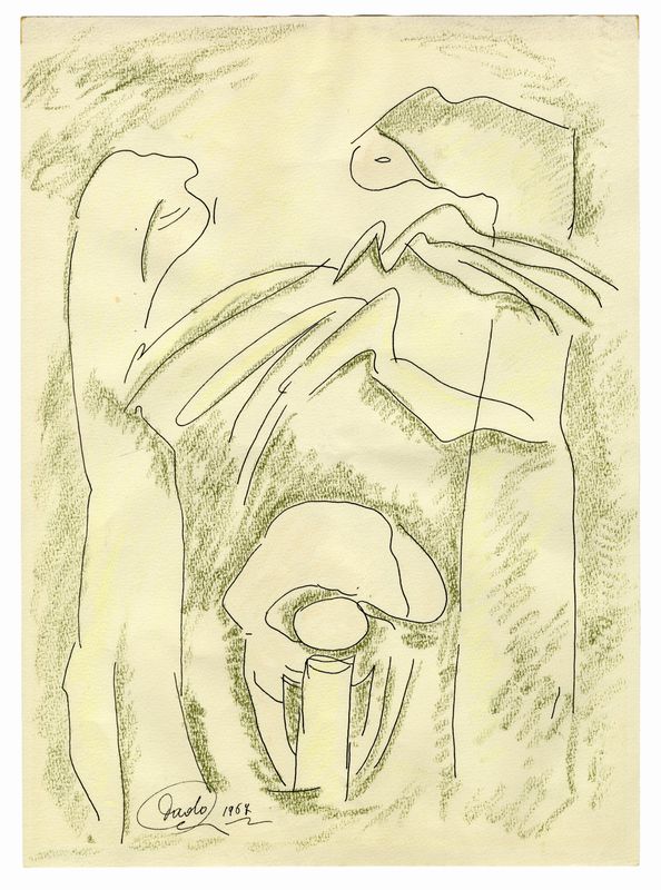 Pastello grasso, acquerello, penna e inchiostro di china su carta. Firmato e datato in basso a sinistra.