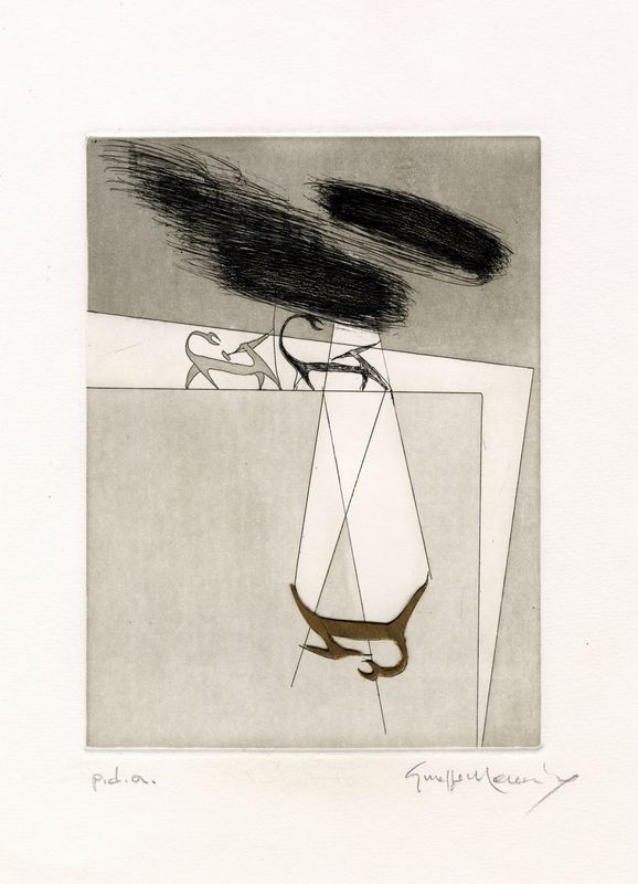 Acquatinta e inserto di legno a collage. mm 240x180. Foglio: mm 500x345. Firmata a matita in basso a destra e "p.d.a" in basso a sinistra. Meravigliosa prova d'artista con inserto a mano.