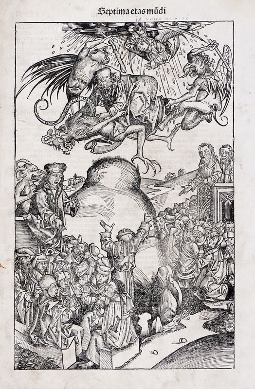 Xilografia. mm 360x290. Foglio: mm 435x630. Folio CCLXIIv (262v) da Liber chronicarum. Nuremberg: Anton Koberger..., 12 luglio 1493. Testo latino. A sinistra l'Anticristo arringa al popolo con il diavolo che gli sussurra all'orecchio. In alto l'Arcangelo Michele brandendo la spada caccia all'inferno l'Anticristo trascinato dai suoi diavoli. Tra i primi libri stampati e sicuramente il più ampiamente illustrato del XV secolo, la Cronaca vide coinvolte negli intagli e nella redazione del progetto molte personalità tra le quali il pittore ed incisore Michael Wohlgemut (Norimberga 1434-1519) e il suo figliastro Wilhelm Pleydenwurff (Norimberga c. 1450-1494); lo stampatore Anton Koberger (Norimberga ca. 1440-1513), gli editori e mecenati Sebald Schreyer (Norimberga 1446-1520) e Sebastian Kammermaister (1446-1503).