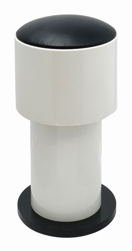 Struttura a doppio cilindro in legno rivestito bianco con base scura e seduta in ecopelle nera. Diametro massimo 36 cm con un'altezza di 70. Rifacimento della seduta progettata da Joe Colombo per il suo mobile bar a scomparsa degli anni '60. Parte ad incastro di un set domestico completo di sedute, tavolo e ripiani dei liquori.