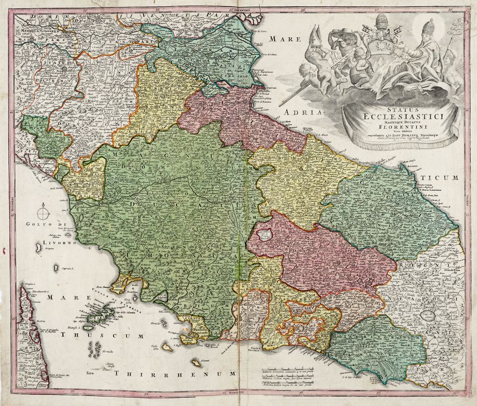 Incisione in rame in coloritura. mm 490x587. Foglio: mm 515x605. Da Atlas Novus Terrarum Orbis Imperia Regna et Status Exactis Fabulis Geographice Demonstrans. Mappa dell'Italia centrale che dal ducato di Ferrara a Nord passando per Bologna si allarga nella descrizione dello stato fiorentino per giungere ai territori di Roma. In alto a sinistra imponente cartiglio per il titolo con la figura del pontefice e delle insegne papali. La scala metrica in basso al centro.