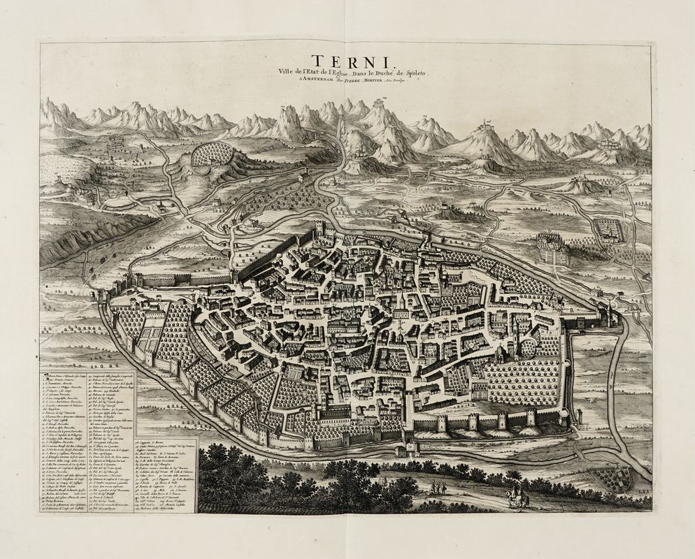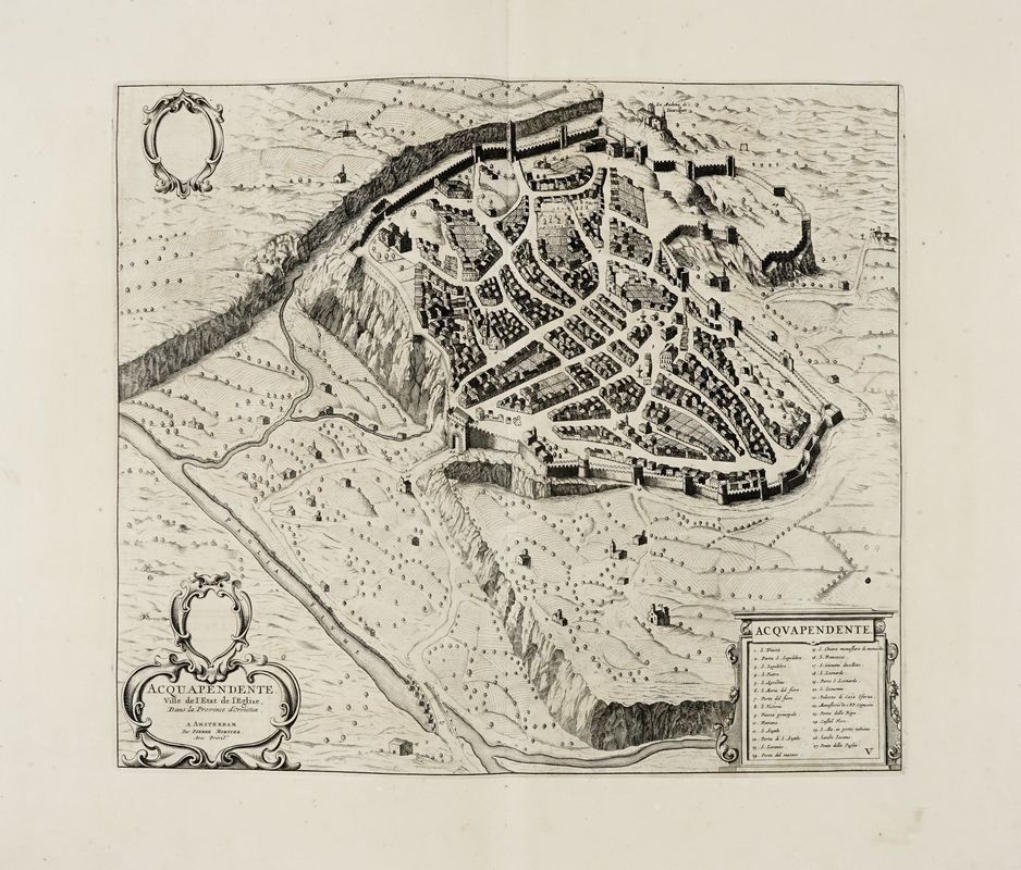 Incisione in rame. mm 450x590. Foglio:mm 580x705. SI AGGIUNGONO: Acquapendente. Ville de l'Etat de l'Eglise. Dans la Province d'Orvietan. Incisione in rame. mm 434x495. Foglio: mm 580x705. / Nocerra in Apenino monte Ville de l'Etat de l'Eglise, dans le Duché de Spoleto. Incisione in rame. mm 420x525. Foglio: mm 525x 663. Lotto di tre tavole da Nouveau theatre d'Italie ou description exacte de ses villes, palais, eglises, opera pubblicata ad Amsterdam nel 1704/1705 e di nuovo nel 1724.