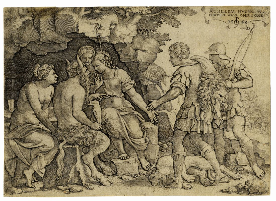 Bulino. mm 135x189. Bartsch, 90. Hollstein, 119. Con il monogramma e la data "1543" sulla tavoletta in alto a destra, a seguire la scritta "CHILLEM HUCNC MA/ GISTRO SUO CHIROONE". Ottima prova nell'unico stato censito da Hollstein, su carta vergellata lievemente spessa con filigrana "scudo araldico". Al verso nota di possesso di Johann Konrad Ammann (1724-1811) e Johann Jacob Ammann (1764-1837), Schaffhouse, (Lugt, 9); marchio a inchiostro violetto di Marco Guidelli Guidi (Asti, 1893- Solara, 1983) con indicazione del luogo "Solara", non su Lugt. Il generale d'artiglieria del Regio Esercito Marco Guidelli Guidi, fu successivamente Comandante militare del Corpo volontari della libertà della provincia di Modena, e infine, nel 1946 Presidente del Tribunale militare di guerra di Milano. Altro marchio stampato con lettera "V" non identificabile.