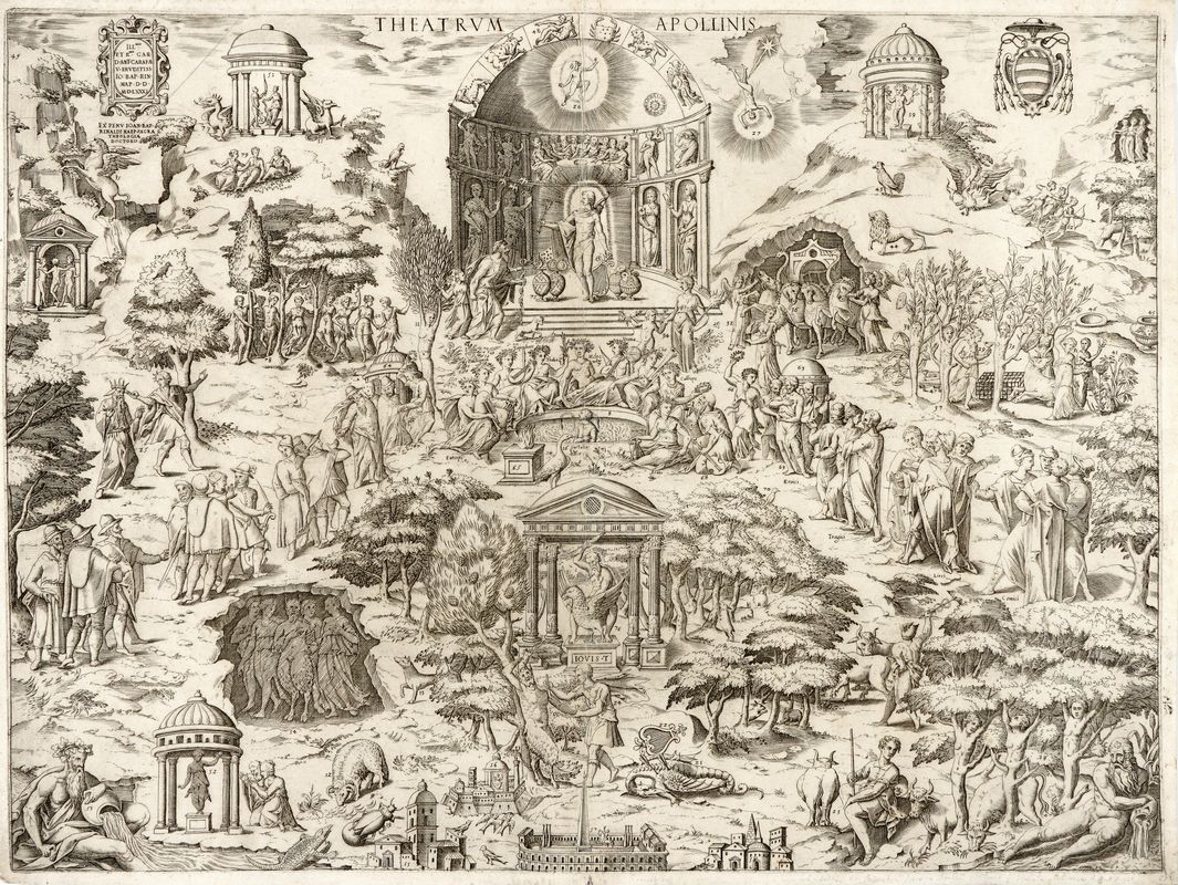 Bulino. mm 405x538. Foglio: mm 420x555. In alto a sinistra cartiglio rettangolare con la dedica di Giovanni Battista Rinaldi, erudito casertano, a Ferrante Carafa, marchese di San Lucido e conte d'Archi (Napoli, 1509-1587), e la data "MDLXXXI". In alto al centro il titolo, con a destra lo stemma dei Carafa. Nella composizione sono presenti numeri che contraddisguono vari episodi mitologici. La tavola è riferita all'opera del Rinaldi Compendio della selva poetica, distinta in theatri. Nella quale si contiene la filosofia di poeti, di platonici, et di peripatetici et dove prencipalmente si spiegano le fittioni di Homero, et di Virgilio, Napoli, appresso Horatio Salviani e Cesare Cesari, 1583. Il volume si presenta come un piccolo trattato di mitologia e allegoria, nel quale l’autore affronta le diverse interpretazioni filosofiche sottese ai miti, diviso in quattro sezioni: il Theatro d’Appollo, il Theatro di Minerva, il Theatro di Nettuno, il Theatro di Plutone. Ogni parte indaga luoghi, monumenti, personaggi mitologici, animali, simboli connessi con la relativa divinità. La tavola, eseguita dal Cartaro in un momento vicino al suo trasferimento a Napoli, ne rappresenta una delle illustrazioni: in collezione pubblica il Theatrum Plutonis (The Israel Museum Jerusalem,inv. B99.1823). Bellissima impressione, avanti la firma di Mario Cartaro in basso a sinistra sopra la divinità fluviale (per un esemplare firmato si veda The British Museum, inv. 1869,0410.1045), su carta vergellata con filigrana "fiore di giglio in cerchio singolo" (simile a Woodward, 98).