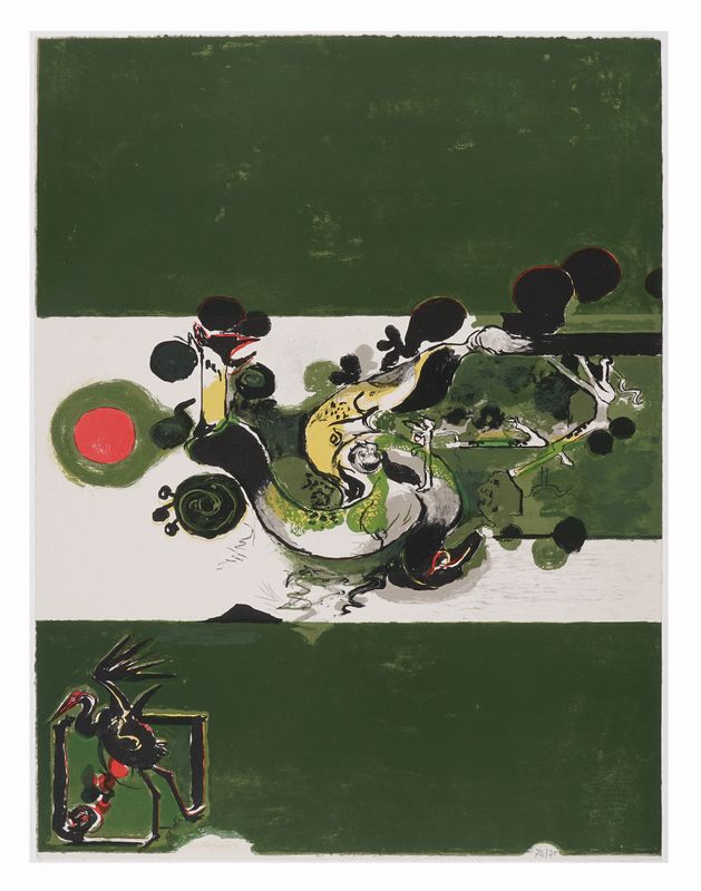 Litografia. mm 625x475. Firmata a pastello arancione in basso a sinistra e numerata a matita in basso a destra. Es. 74/75.