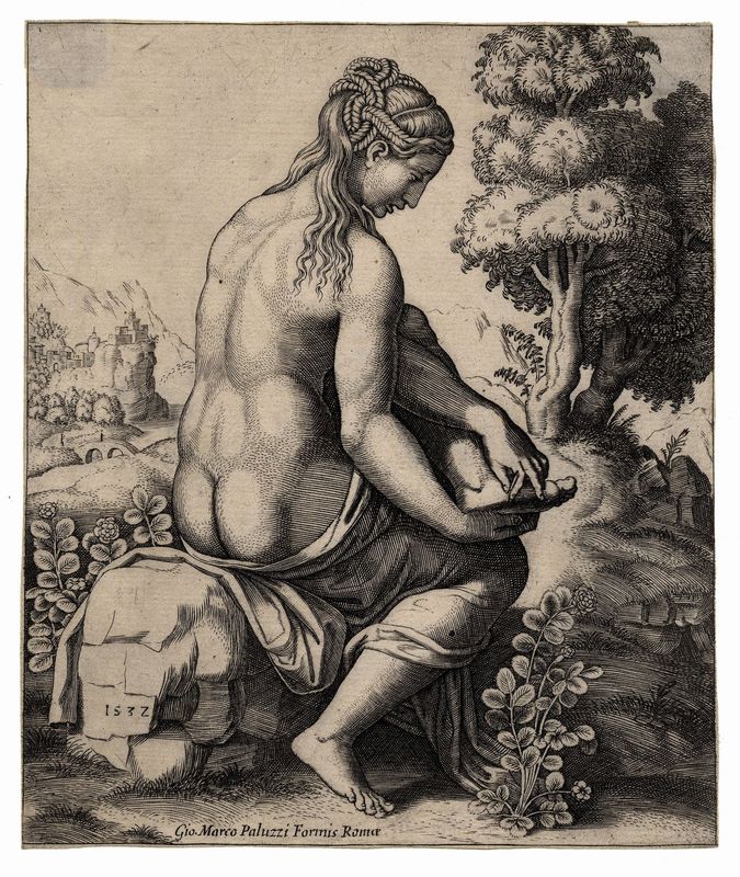 Bulino. mm 190x165. Bartsch, 16. Raphael invenit (stufetta bibbiena), VII, 5d. Da Raffaello. Con la data "1532" sulla roccia in basso a sinistra e con la responsabilità dell'editore "Gio. Marco Paluzzi Formis Romae" in basso al centro. Bellissima impressione nel III stato di 3 con l'indirizzo di Giovanni Marco Paluzzi (circa 1600-1610), stampata con inchiostrazione brillante e piena su carta vergellata sottile priva di filigrana.
