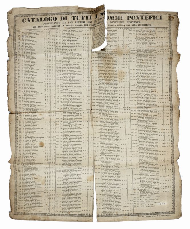 Acquaforte in coloritura. mm 515x740. Foglio: 575x810. Titolo in latino e in spagnolo. Duecentosessanta cornici rotonde contenenti 258 ritratti di pontefici, l'ultima con l'effigie di Gregorio XVI eletto nel 1831 e la prima con l'immagine di Gesù rivolta a destra verso Pietro e i suoi successori. La grande tavola è accompaganta da un foglio di catalogo con tutti i nomi dei pontefici, patria e anno di elezione, stampato nella tipografia di Carlo Massa ad Asti con la data 1832.