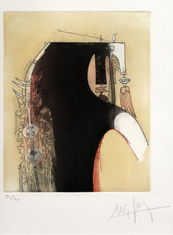 Acquatinta. mm 295x245. Foglio: mm 624x440. Firma a matita in basso a destra e tiratura in basso a sinistra. Es. 30/130.