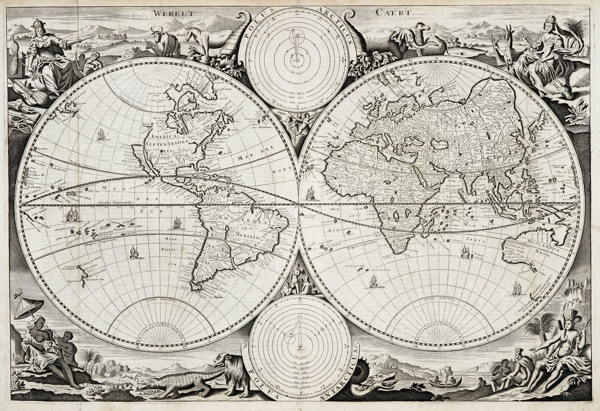Incisione in rame. mm 305x460. Foglio: mm 340x484. Mappa del mondo a due emisferi esemplificata su quella di Nicolas Visscher del 1663. Agli angoli rappresentazioni allegoriche dei quattro continenti con abitanti nativi e fauna selvatica. Al centro due diagrammi raffiguranti il sistema tolemaico e copernicano del sistema solare. La costa nord-occidentale del Nord America è in parte d'invenzione con l'immaginario El Streto d'Anian. La California è raffigurata come una penisola. Sorprendentemente, la mappa mostra anche la Grande Muraglia Cinese. Nel Pacifico, l'Australia occidentale si iniziia a intravedere così laTasmania, e la costa orientale della Nuova Zelanda (nell'emisfero occidentale). L'Antartide è completamente assente.