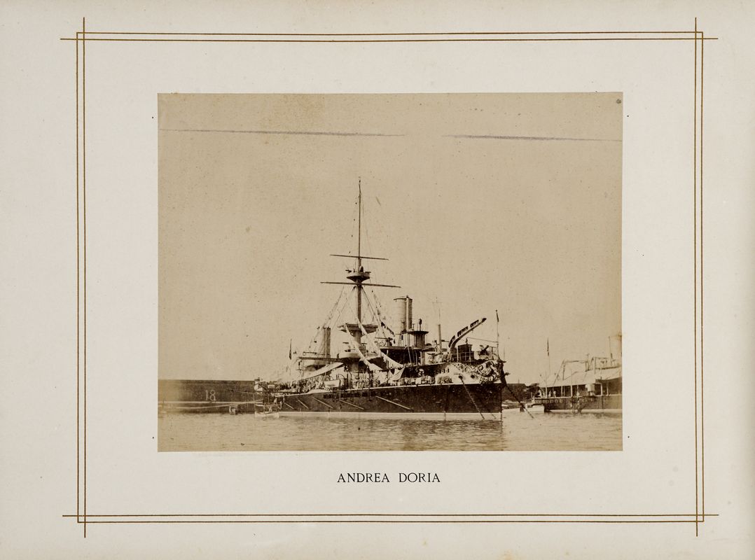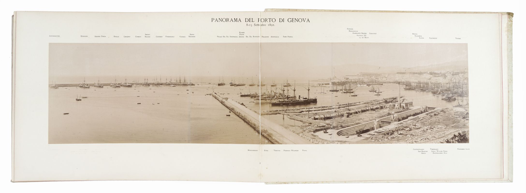 Album composto di 56 fogli (bianchi o con testo a stampa) e 41 tavole, su cui sono applicate 39 fotografie di navi e un panorama del Porto di Genova in tre fotografie assemblate (albumine, mm. 210x265 circa), inquadrate entro cornice dorata. Coperta in piena pergamena, con immagine sul piatto anteriore acquerellata; tagli rossi. Stampato a Roma, presso Forzani & C. Tipografia del Senato. Rilegatura "A. Staderini, Roma" (indicazione a caratteri capitali e dorati, impressi nel contropiatto anteriore). Buono stato di conservazione, con un leggero foxing sui fogli, abrasioni e residui di carta di giornale sul piatto posteriore.