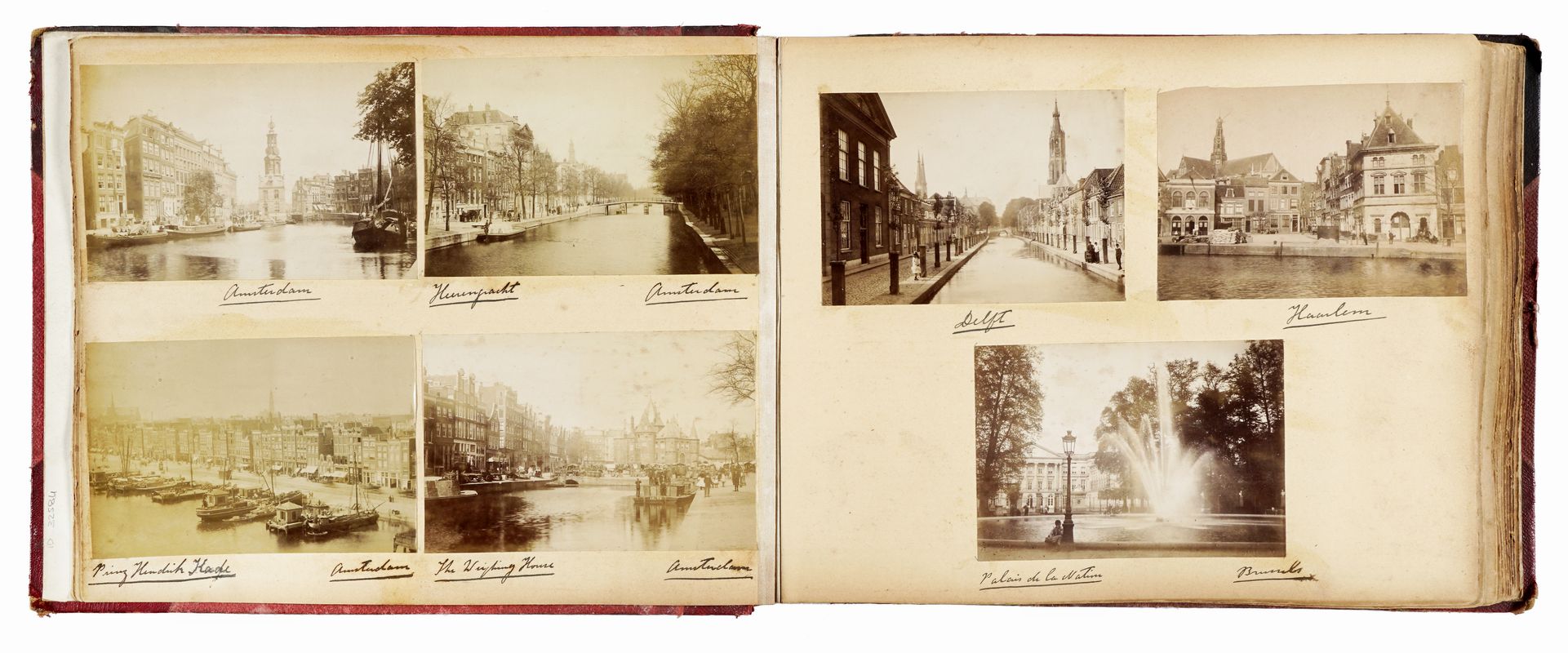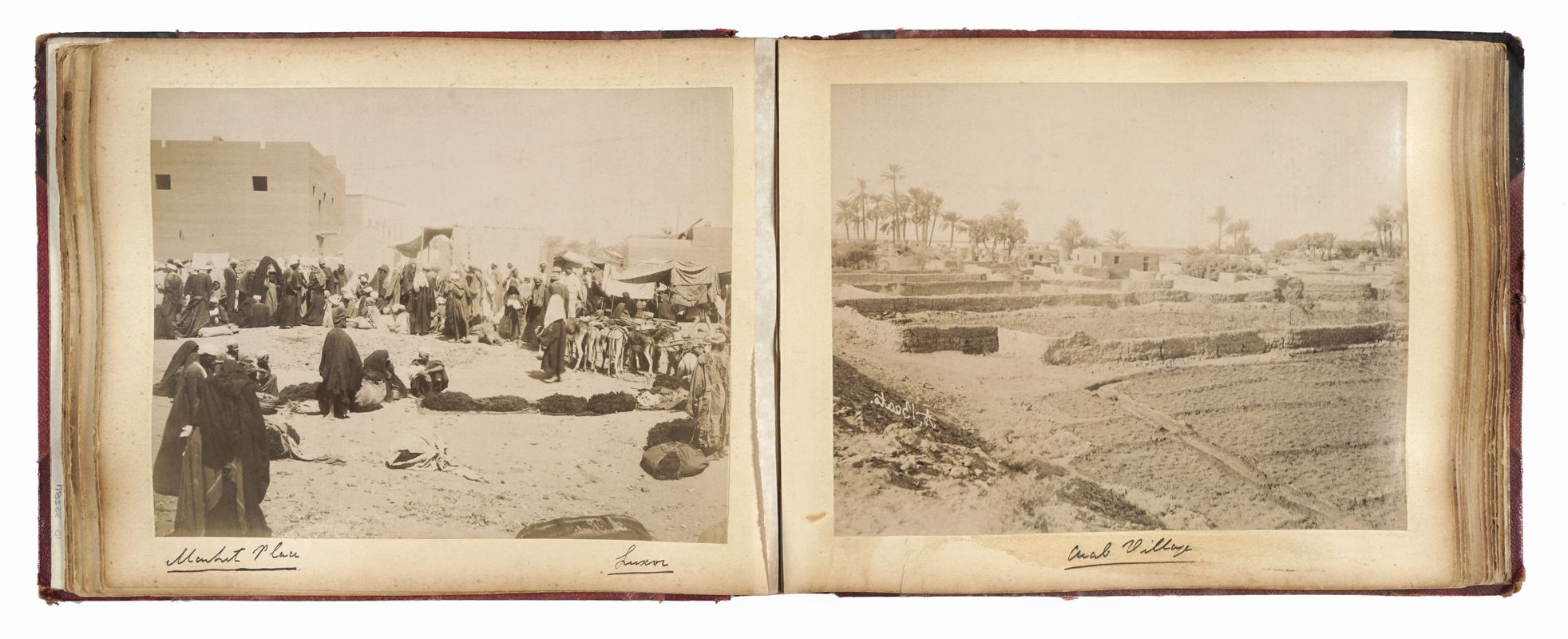 Album mm. 250x320, con 77 albumine di vari formati (mm. 110x180 circa e mm. 215x270 circa) di autori vari, con immagini relative a vedute di varie città europee, riproduzioni di dipinti nei musei delle stesse città e vedute varie di località e di costumi egiziani, prevalentemente di Antonio Beato, di Pascal Sebah e di Félix Bonfils. Legatura in mezza pelle rossa con punte, piatti in percallina; dorso con decori e titolo "SCRAP/BOOK" impressi in oro. Lacune nei piatti e lungo le unghiature. Molte immagini recano, inscritte nei negativi, didascalie e firme degli autori. Sulle tavole, sotto le immagini, didascalie manoscritte a inchiostro. Nel contropiatto anteriore la nota manoscritta non coeva "Beato - photos 1860-1880". Nel foglio di guardia, l'ex libris (timbro a secco tondo) "BRIAN VICTOR ME EVEDY" con la sigla "BVM" al centro e sotto, a matita, il numero "1316". Immagini in stato di conservazione generalmente buono, alcune stampe presentano alterazione dei toni (ingiallimento), qualche piccolo strappo, o alcune lacune, graffi e abrasioni.