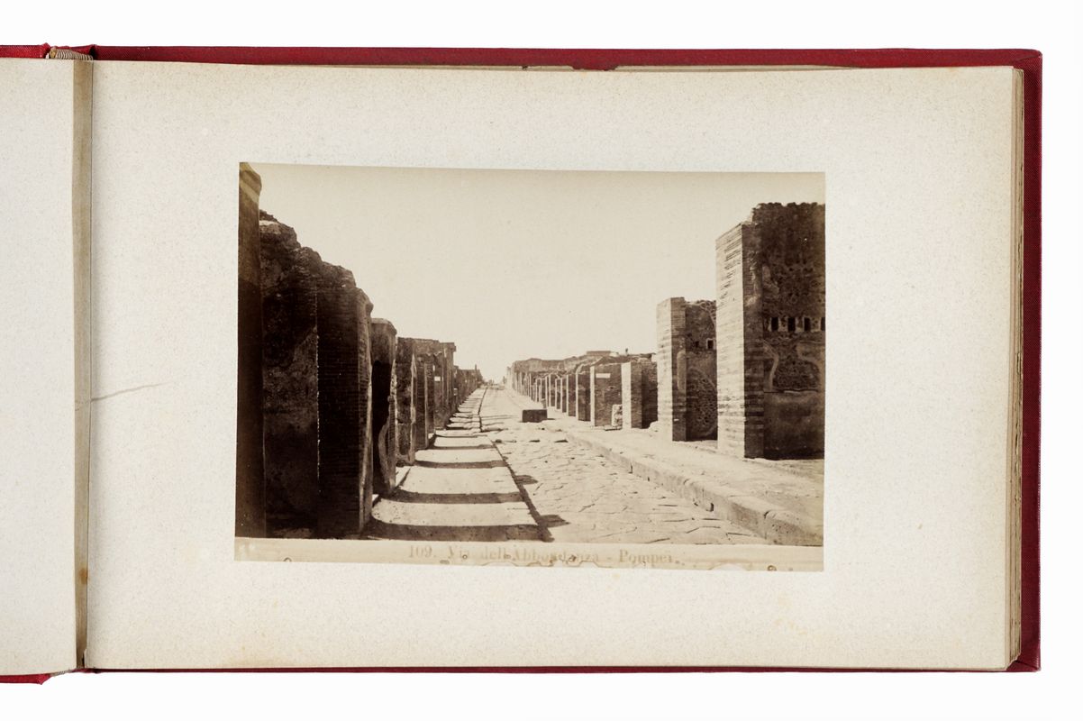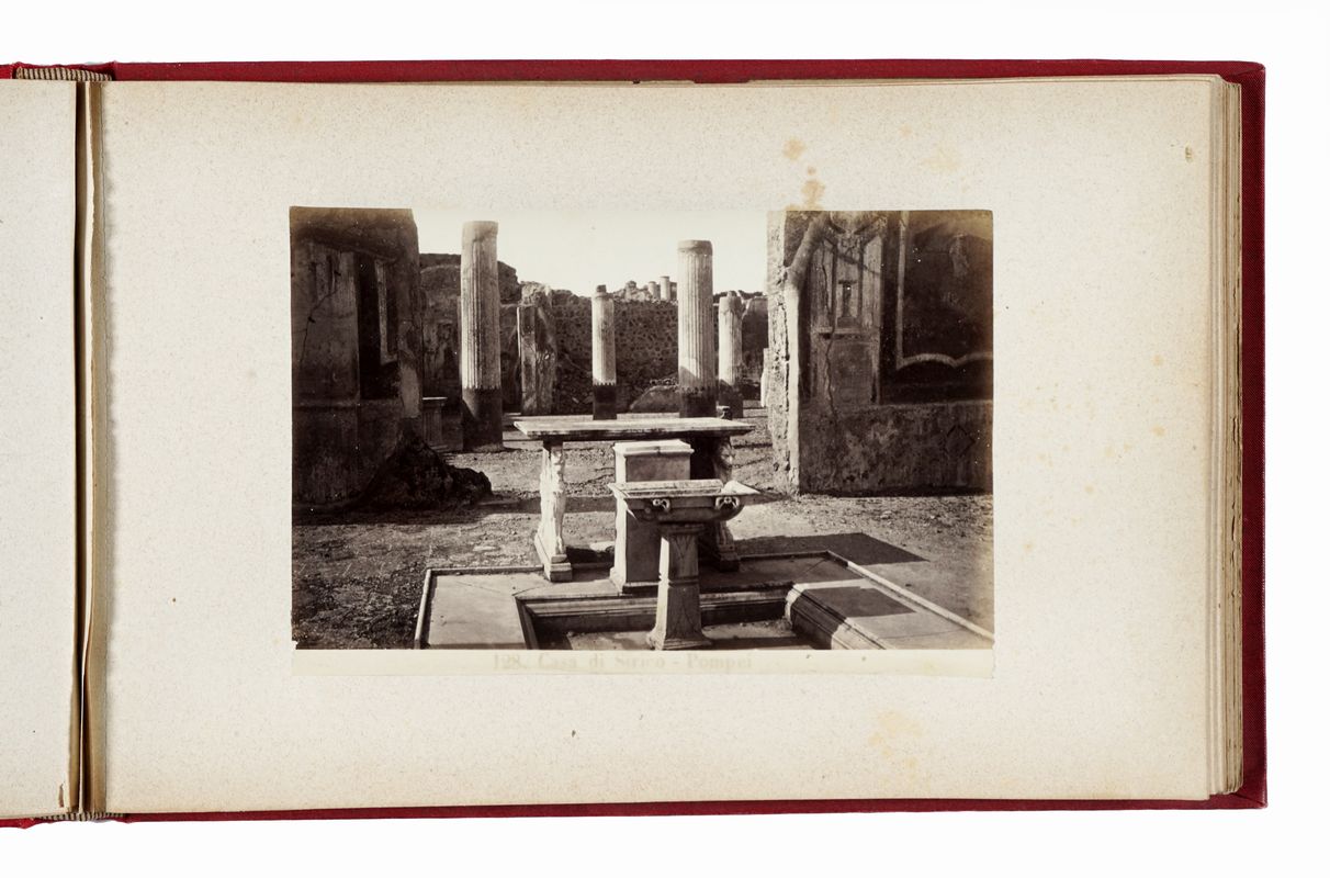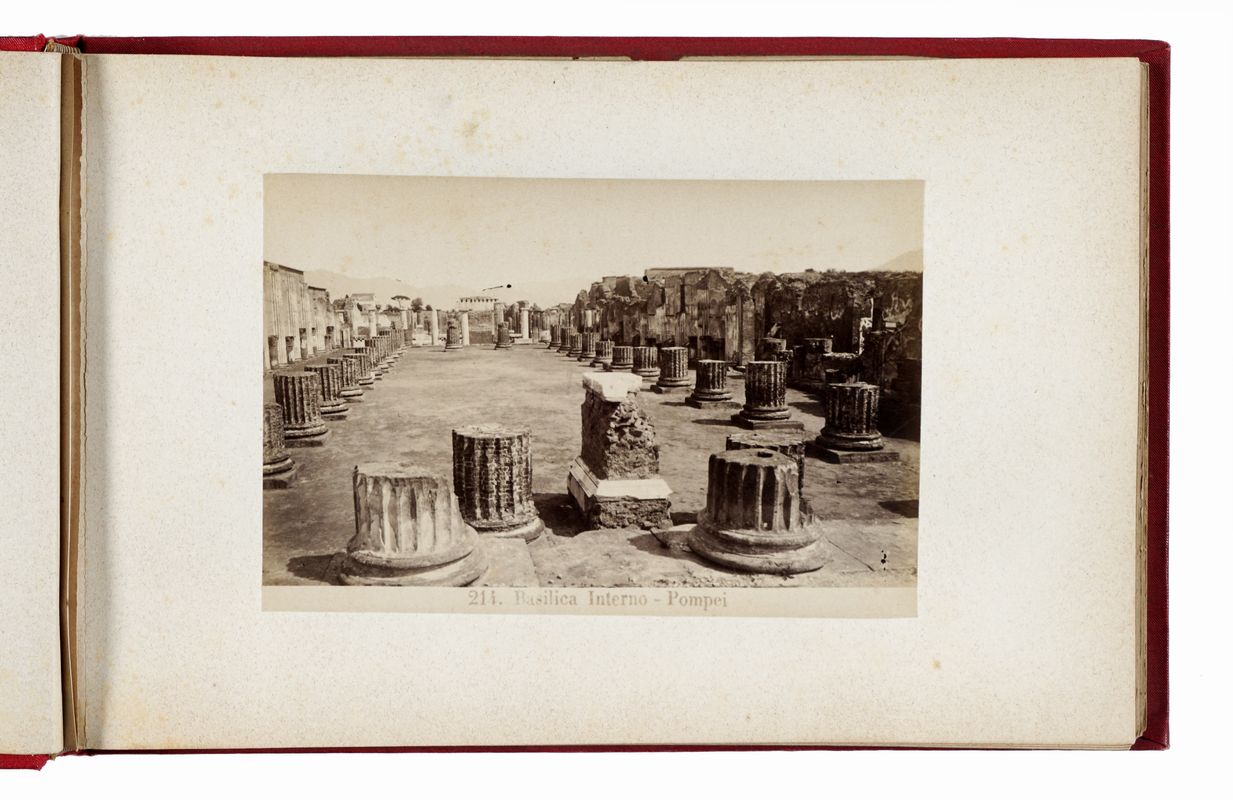 Album in 48 tavole, mm. 155x240, con 48 albumine, mm. 100x150 e un frontespizio a stampa (litografia). Coperta in tela rossa, con piatti sui quali è impressa una decorazione geometrica e mistilinea lungo i bordi e, sul piatto anteriore, il titolo impresso in caratteri dorati: "POMPEI". Le immagini recano in basso didascalie, in etichette applicate sui negativi, con caratteri a stampa o in corsivo. Nel frontespizio, un disegno con il Vesuvio e rovine pompeiane fa da sfondo al titolo "SOUVENIRS / DE / POMPEI" e alle indicazioni editoriali: "Euf.o Mauri. Fotografo" (in basso a sinistra) e "Napoli. Piazza Cavour 49" (in basso a destra), oltre a "Lit. Pagnotta". Macchie di sporco sulla coperta e foxing sui cartoni; le stampe presentano in genere alterazione nei toni (ingiallimento).