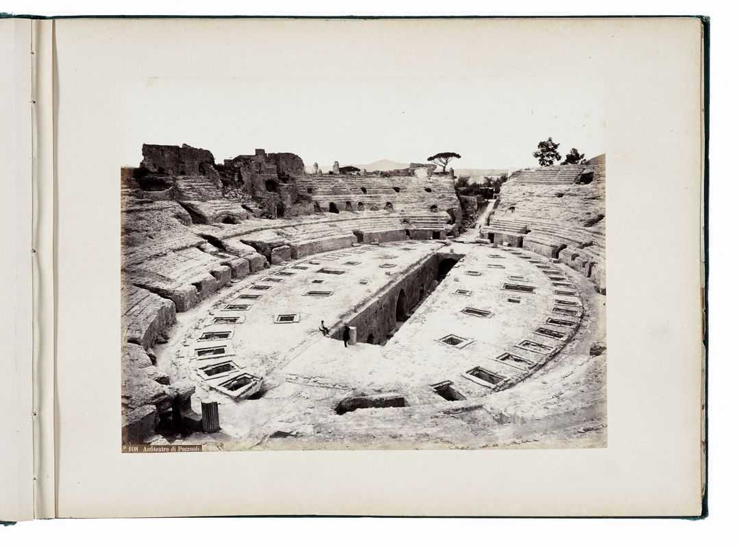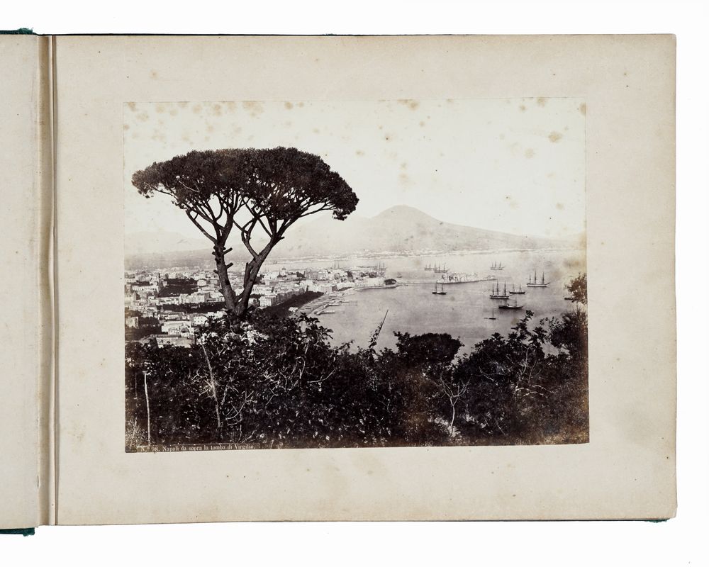 Album in 53 fogli, mm. 261x345, contenente 50 albumine in vari formati (mm. 195x255 circa), due fogli di guardia e un foglio bianco su cui, in alto a destra, è l'annotazione a inchiostro: "Helenpagge [?] / March 1871". Tutte le immagini recano in basso le didascalie con l'indicazione del soggetto e il relativo numero del catalogo dello studio Rive (in etichette applicate sui negativi). Coperta in percallina verde con piatti decorati in oro; sul piatto anteriore, impresso in caratteri dorati, il titolo: "SOUVENIRS / DE/ NAPLES" e, sul dorso, in caratteri dorati: "R. RIVE / NAPOLI". Contropiatti e fogli di guardia in carta moiré. La prima fotografia (mm. 140x240), che funge da frontespizio, è la riproduzione di un disegno (o incisione) con la scritta "Napoli" e il capolettera N fregiato dalle immagini del Vesuvio e della collina del Vomero, con Castel Sant'Elmo e la Certosa di San Martino. Ad eccezione delle prime fotografie, che presentano macchie di foxing, le stampe sono generalmente in buone condizioni, alcune un po' ingiallite, soprattutto lungo i margini; in alcune immagini sono evidenti ritocchi originali in corrispondenza di piccole lacune nell'emulsione. Fogli un po' ingialliti e con macchie di foxing. L'ultimo foglio di guardia è staccato. Nella legatura, parziali distacchi dei piatti dal dorso e una macchia (deposito di sporco) sul piatto anteriore.