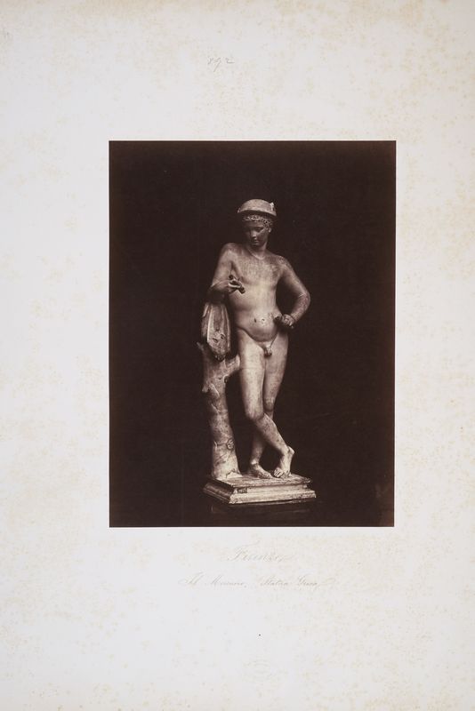 Carta salata, mm. 328x244, applicata su cartone originale, mm. 638x486, che reca, in basso al centro, il timbro a secco ovale: "FRATELLI ALINARI / FOTOGRAFI / FIRENZE / PRESSO LUIGI BARDI". Titolo sul supporto in basso al centro, a inchiostro: "Firenze / Il Mercurio, Statua Greca" e, in alto al centro, a matita, il numero "292". Opera in ottimo stato, dai toni vigorosi (viraggio all'oro), piccole macchie di foxing diffuso sul cartone.