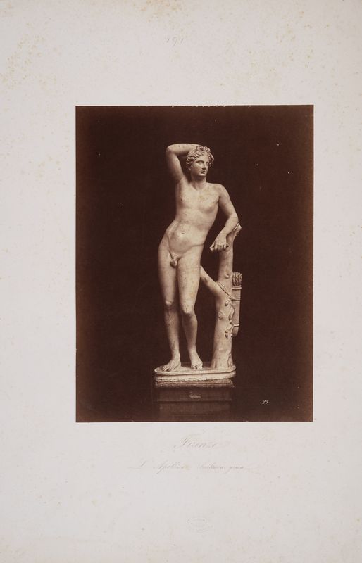 Carta salata, mm. 335x254, su cartone originale, mm. 633x485, che reca, in basso al centro, il timbro a secco ovale: "FRATELLI ALINARI / FOTOGRAFI / FIRENZE / PRESSO LUIGI BARDI" e il titolo a inchiostro: "Firenze / L'Apollino, Scultura greca"; in alto al centro, a matita, il numero "291". Nell'immagine in basso a destra, il numero "25." (inscritto nel negativo). La stampa è in ottimo stato. Cartone di supporto con filigrana in alto al centro "BFK. RIVES", leggermente sporco ai margini.