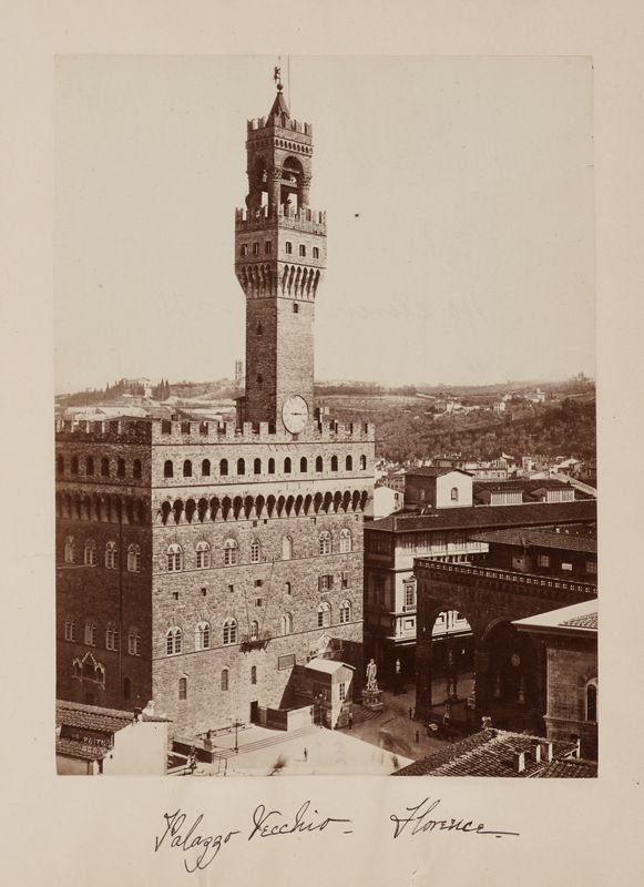 Albumina, mm. 211x160, applicata su cartone, mm. 328x252, che reca, sotto l'immagine, l'annotazione a inchiostro: "Palazzo Vecchio - Florence". Nell'immagine, nell'angolo in basso a sinistra, è impresso a secco il marchio: "FRITH'S / SERIES". Immagine in ottimo stato, il cartone presenta diverse deformazioni (ondulazioni) e, nel margine inferiore, uno strappo, una lacuna e delle pieghe.