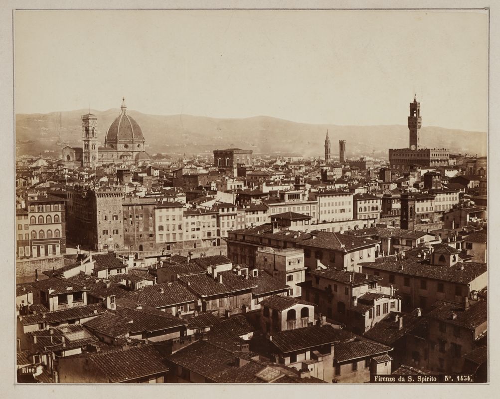 Albumina, mm. 198x254, applicata su cartone, mm. 265x326 e riquadrata lungo i margini da una filettatura a matita. Nell'immagine, in etichette nel negativo, in basso a sinistra "Rive" e a destra "Firenze da S. Spirito N°. 1454.". Sul verso del supporto, annotazione a inchiostro: "View of Florence showing the towers". Buono stato di conservazione.