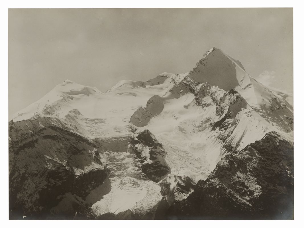 Gelatina ai sali d'argento, mm. 297x398, virata in doppio tono. Sul verso, annotazione a matita: "Grivola, P. Bianca, P. Rossa, P. Nera / Glacier du Trajo - de la P.te du Dr[...] / téléphotographie". Stampa in buono stato di conservazione, con un po' di specchio d'argento e una piccola lacuna in basso verso sinistra.