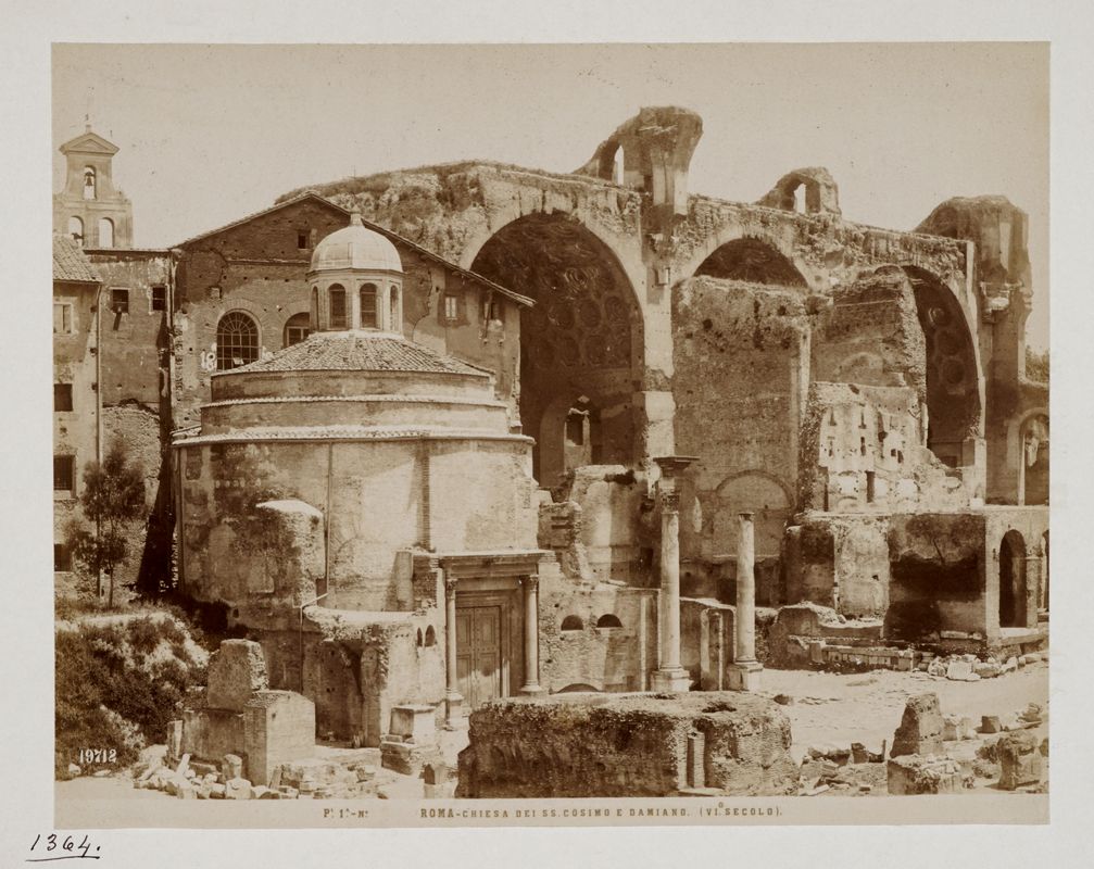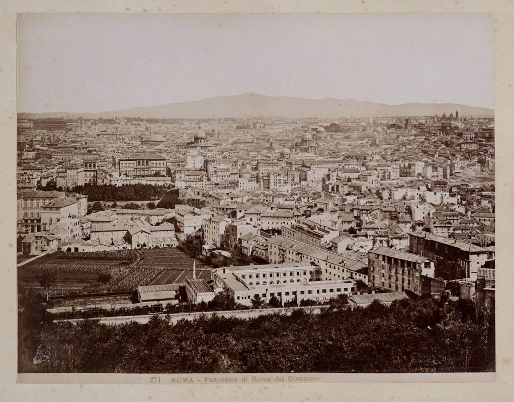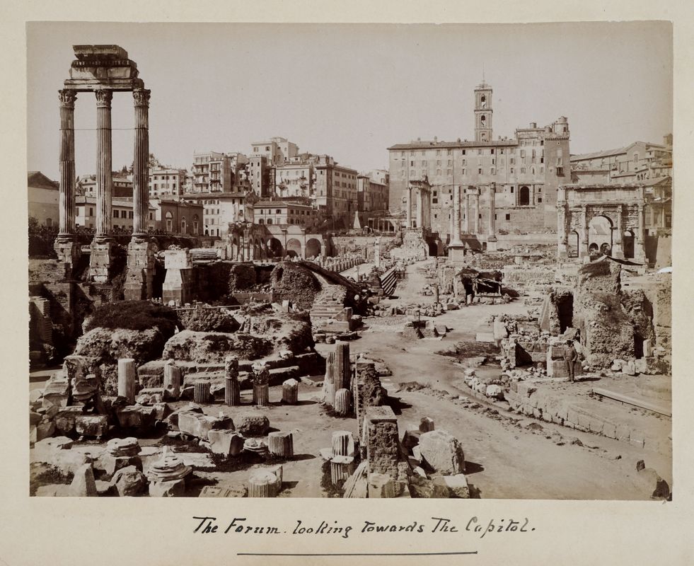 Dieci albumine in vari formati, mm. 190x240 circa, su cartoni di vario formato, mm. 260x360 circa Quasi tutte le immagini recano una didascalia fotografica in basso (nel negativo), con indicazioni di soggetto e numero di catalogo dello studio fotografico; soltanto una ha una didascalia manoscritta a inchiostro sul supporto ("the Forum looking towards the Capitol."). Stampe generalmente in buono stato, cartoni di supporto ingialliti, con macchie di foxing e lacune lungo i margini.