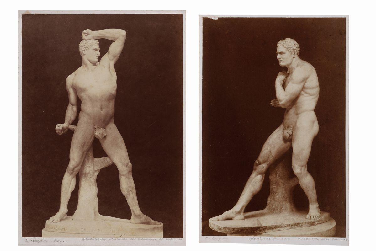 Due albumine, mm. 250x180 e 244x159, ognuna su un cartone, mm. 264x189 e 257x165 (montate insieme in un unico passepartout). Su entrambi i cartoni di supporto, in basso, a matita, annotazioni a matita: 1) "E. Beguin – Rome"; "Gladiatore Creugante di Canova al Vaticano". 2) "E. Beguin - Gladiatore Damosseno di Canova alle Vaticano". Stampe in buono stato, virate (la foto 2 ha una piccola lacuna in alto a sinistra).