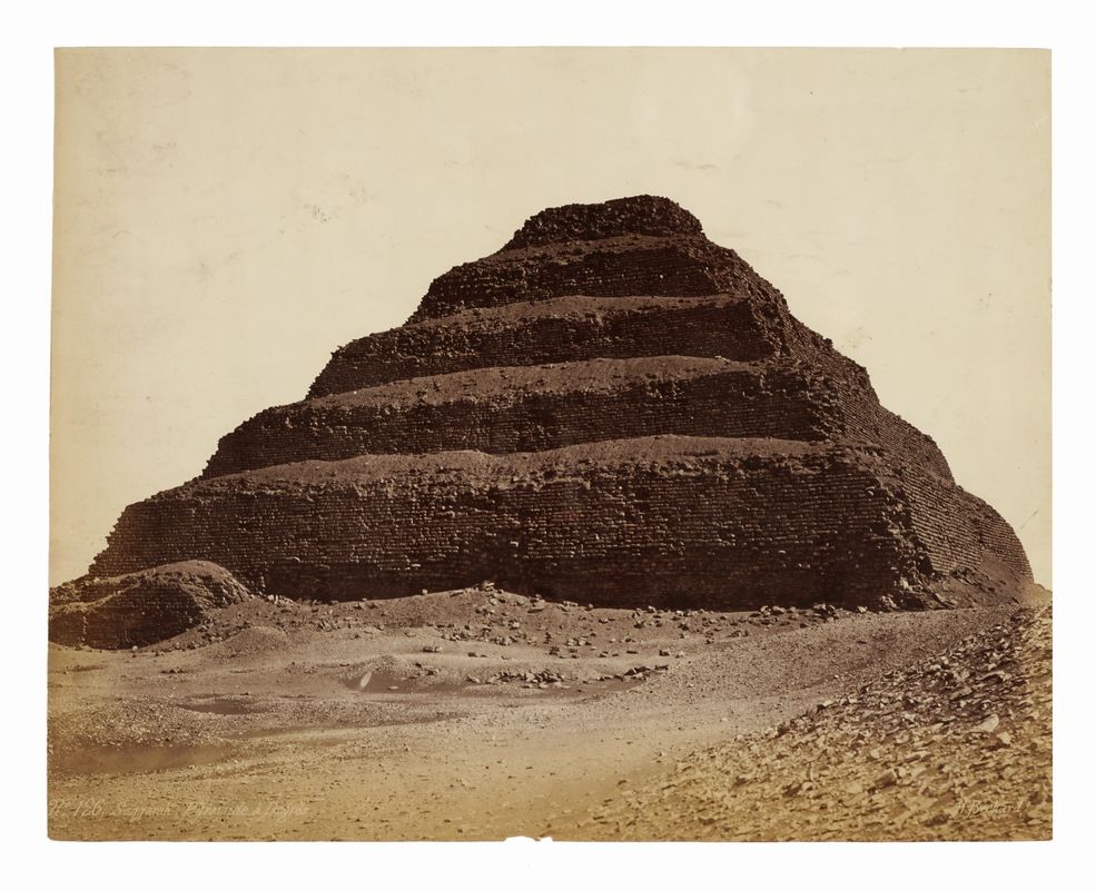 Due albumine: 1) Le tre Piramidi di Giza, mm. 268x374 (su cartone non originale, mm. 379x483). Nell'immagine, in basso a sinistra, iscrizione nel negativo: "N. 146, 2e, 3e et 4e Pyramides". 2) Piramide a Saqqara, mm. 209x264. Nell'immagine, in basso a sinistra, iscrizione nel negativo: "N.° 126, Saqqarah, Pyramide à Degrès". In entrambe, in basso a destra, firma inscritta nel negativo "H. Béchard". Le stampe sono in buono stato, la foto 1 presenta alcune lacune in basso e lungo il margine superiore; la foto 2 presenta sul verso residui del distacco da un supporto, piccole lacune e piccoli strappi lungo i margini.