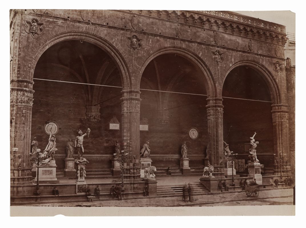 1) Firenze. Veduta di San Miniato. Albumina, mm. 182x249, con didascalia fotografica lungo il margine inferiore: "Firenze - 76 Panorama del Monte delle Croci". 2) Firenze. Loggia dei Lanzi. Albumina, mm. 178x250, con didascalia fotografica lungo il margine inferiore, ormai quasi illeggibile: "Firenze - [...] Loggia dell'Orgagna". Le due stampe, virate, sono in buono stato, presentano alcune pieghe e deformazioni.