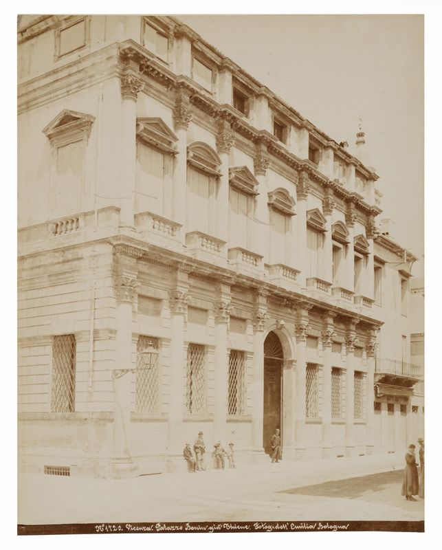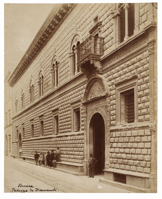Quattro albumine, mm. 210x260 circa, applicate su cartoni originali, mm. 245x330. Con didascalie in etichette applicate sui negativi, nel margine inferiore o laterale delle immagini, che recano l'indicazione di responsabilità: "Fotog. dell'Emilia Bologna" e i titoli : 1) "Ferrara. N. 604. Duomo."; 2) "N. 1720. Vicenza. Palazzo Bonin già Thiene"; 3) "Vicenza. N. 1792. Palazzo Porto Barbaran". 4) non ha la didascalia fotografica, ma l'iscrizione a inchiostro, in basso a sinistra nell'immagine: "Ferrara / Palazzo dei Diamanti". Stampe in buono stato; la fotografia 4 ha una lacuna in basso; cartoni di supporto ingialliti e con depositi di polvere.