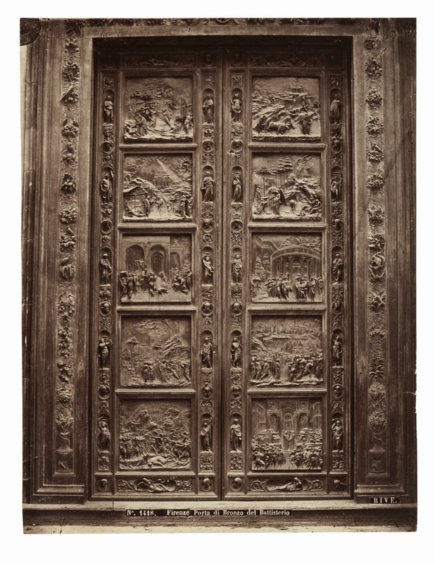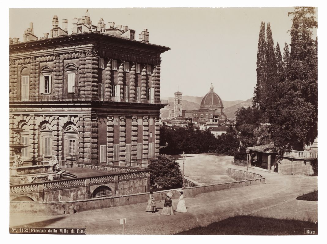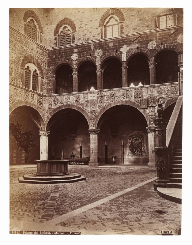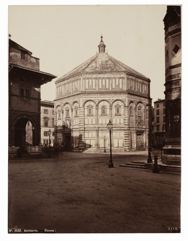 Sei albumine di misure varie (mm. 250x195 circa), alcune applicate su cartoni, mm. 330x260 circa. Raffigurano vedute di Firenze e recano nelle immagini, in basso, entro etichette applicate sui rispettivi negativi, l'indicazione di autore ("RIVE", o "Rive", a destra), il soggetto e il numero di catalogo del fotografo (a sinistra): 1) "Loggia de Lanzi. Firenze. N.° 1438.", applicata su cartone con il timbro ovale a secco "ROBERT RIVE / NAPLES". 2) "1441. Palazzo del Podestà. (interno). Firenze". 3) "N°. 1452. Firenze dalla Villa di Pitti". 4) "N°. 1455. Firenze da S. Miato", applicata su cartone con, in basso al centro, il timbro a secco ovale "ROBERT RIVE / NAPLES". 5) e 6) Due vedute del Battistero su un unico cartone rifilato: "N°. 1422. Battisterio. Firenze" e "N°. 1418. Firenze Porta di Bronzo del Battistero". Lo stato di conservazione delle stampe, virate, è generalmente buono, con qualche piega e ondulazione dei fogli, qualche piega agli angoli dei cartoni di supporto, e alcune con leggera alterazione di toni lungo i margini.