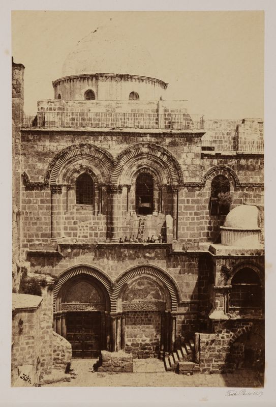 Tre albumine, mm. 160x225 circa, su cartoni originali, mm. 190x270 circa. Sui supporti, in basso a destra, in caratteri a stampa litografica: "Frith. Photo. 1857." 1) Gerusalemme. Entrata alla chiesa del Santo Sepolcro. Nell'immagine, in basso a sinistra, firma "Frith" inscritta nel negativo e il numero "195" (?). 2) L'antica città di Gaza. Nell'immagine in basso a destra, iscrizione nel negativo "Frith 190". 3) Tempio circolare a Baalbek. Nell'immagine, in basso a sinistra, firma inscritta nel negativo "Frith Phot". Sul verso dei supporti recenti annotazioni manoscritte a matita, con indicazioni dei soggetti (Tav. 18 "Entrance of the Church of the Holy Sepulchre (Jerusalem)"; Tav. 10 Gaza (The Old Town); Tav. 35 "The Circular Temple (Baalbec)") e della serie di riferimento: F. Frith, Sinai and Palestine, 1857. In ottimo stato di conservazione. In passe-partout con coperta in cartone acid-free.