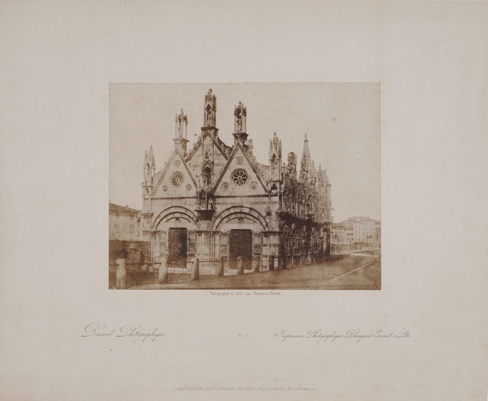 Carta salata (da negativo su carta), mm. 148x197, su cartone originale, mm. 300x374, con le iscrizioni editoriali in caratteri litografici: "Photographié et édité par Blanquart-Evrard" (sotto l'immagine); in basso: "Recueil Photographique // Pl. 7 [numero aggiunto a matita] – Imprimerie Photographique Blanquart-Evrard à Lille"; in basso al centro, a matita: "Santa Maria della Spina a Pisa". Stampa in ottimo stato; cartone con residui di nastro adesivo sul verso e un piccolo strappo sul margine superiore.