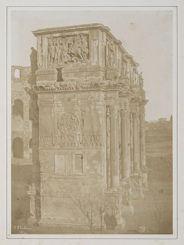 Carta salata (da negativo su carta), mm. 331x242, applicata su cartone originale, mm. 426x304, con riquadratura dell'immagine a inchiostro e nome dell'autore annotato a matita in alto a destra. Firma e data nell’immagine, in basso a sinistra (nel negativo): "F. Flachéron / 1851". La stampa, come generalmente le prove di questo autore, presenta un indebolimento nei toni, soprattutto nella parte inferiore. In passe-partout con coperta in cartone acid-free.