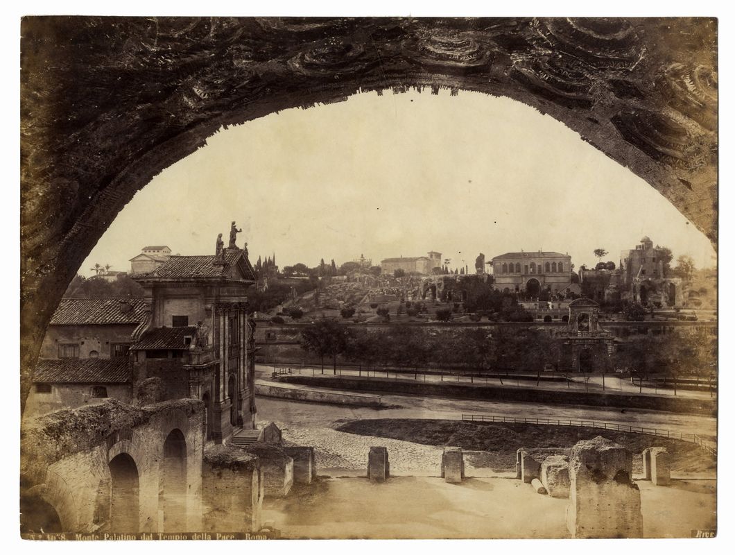 Albumina, mm. 195x254. Nell'immagine in basso (in etichette sul negativo), a sinistra, didascalia: "N.° 1058. Monte Palatino dal Tempio della Pace Roma", a destra: "Rive". Sul verso, annotato a matita, "Palatino". Ingiallimento (solfurazione) nei margini destro e inferiore. In passe-partout con coperta in cartone acid-free.