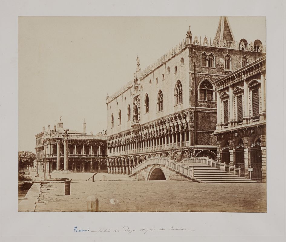 Albumina, mm. 225x284, applicata su cartone, mm. 338x492, entro uno schiaccio. Sul supporto, in basso al centro, a inchiostro blu e nero: "Venise: palais des Doges et quai des Esclavons". In alto a destra, a matita, annotazione a matita non coeva: "vers 1855". Stampa in ottimo stato. In passe-partout con coperta in cartone acid-free.