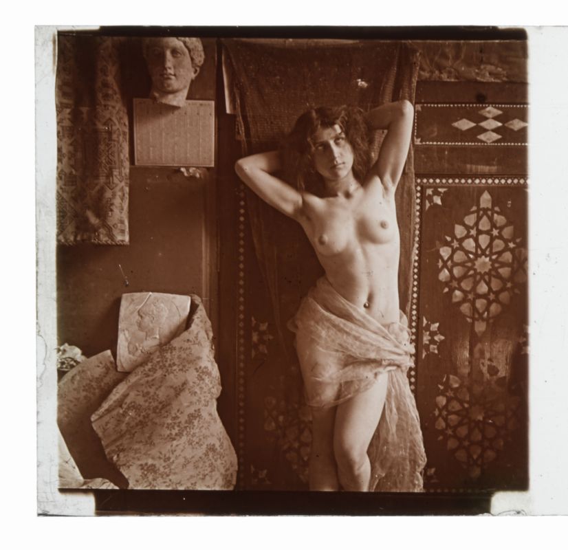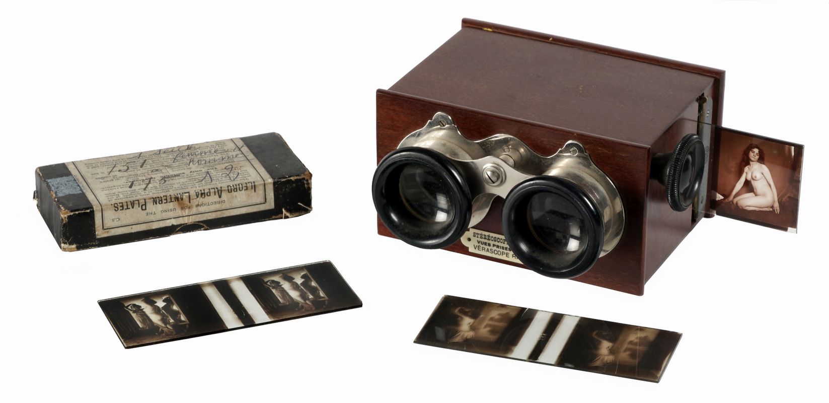 Visore stereoscopico in legno con targa: "STEREOSCOPE Breveté S.G.D.G. / VUES PRISES AVEC LE / VERASCOPE RICHARD"; in buone condizioni. Si aggiunge una serie di 13 diapositive stereoscopiche su vetro (ILFORD Alpha Lantern Plates), mm. 44x107. Sul coperchio della scatola che contiene le diapositive, l'annotazione a inchiostro: "151 à 175" e aggiunta, con altra grafia, la nota "1 seule / femme et homme". Il visore stereoscopico in buone condizioni. Due diapositive rotte (lacune in un angolo).