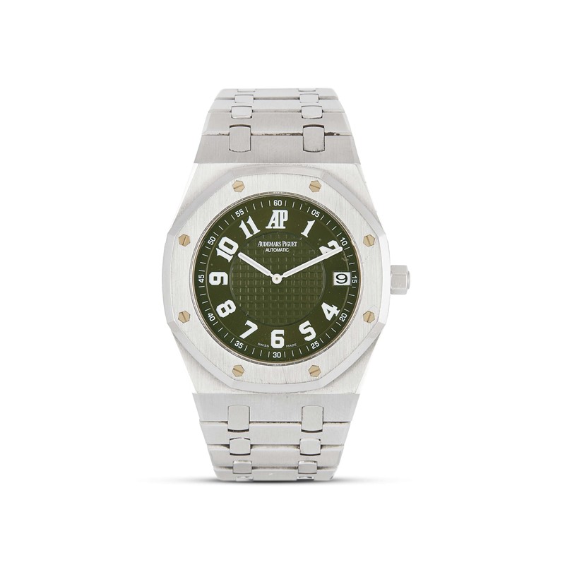cassa monoblocco in acciaio, fondello con movimento a vista, ghiera ottagonale in acciaio con viti in oro bianco, quadrante kaki Grand Tapisserie firmato AP, grafica bianca, numeri arabi al superluminova, datario a ore tre, movimento a carica automatica cal 2121/3 n. 540890, bracciale a maglie in acciaio, lungh. interna cm 19 circa, chiusura in acciaio deployant a scomparsa marcata Audemars Piguet, vetro minerale. Diam. mm 38. Accompagnato da ulteriore meccanismo intercambiabile con un quadrante supplementare di colore blu, diam. mm 38. Corredato di scatola, controscatola, garanzia e certificato di autenticità.