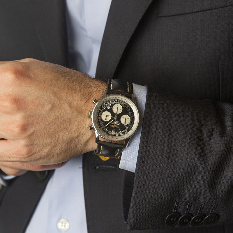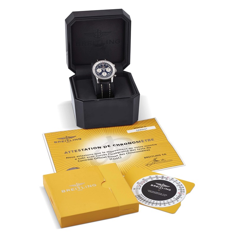 cassa in acciaio, fondello a vite, ghiera zigrinata, corona marcata, tasti a pompa, quadrante argenté, grafica nera, indici applicati e numeri arabi stampati, contatore dei secondi a ore nove, contatore dei minuti a ore tre, contatore delle ore alle sei, datario tra le ore quattro e le ore cinque, movimento a carica automatica cal ETA n. 2440947, cinturino in pelle nera, fibbia in acciaio marcata Breitling, vetro minerale. Diam. mm 40