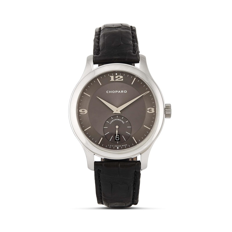 cassa in acciaio, fondello serrato con viti con movimento a vista, corona marcata, lunetta in acciaio, quadrante antracite, grafica bianca, indici e numeri arabi applicati di color argento, secondi e datario a ore sei, movimento a carica automatica n. 108118, cinturino originale in pelle nera, fibbia in acciaio marcata Chopard, vetro minerale. Diam. mm 40
