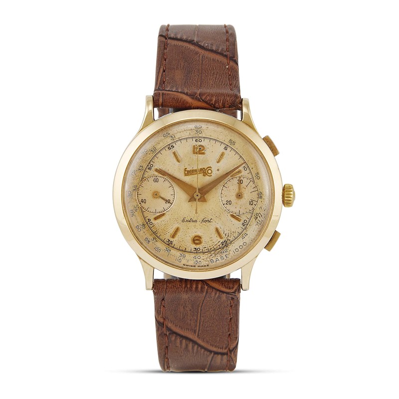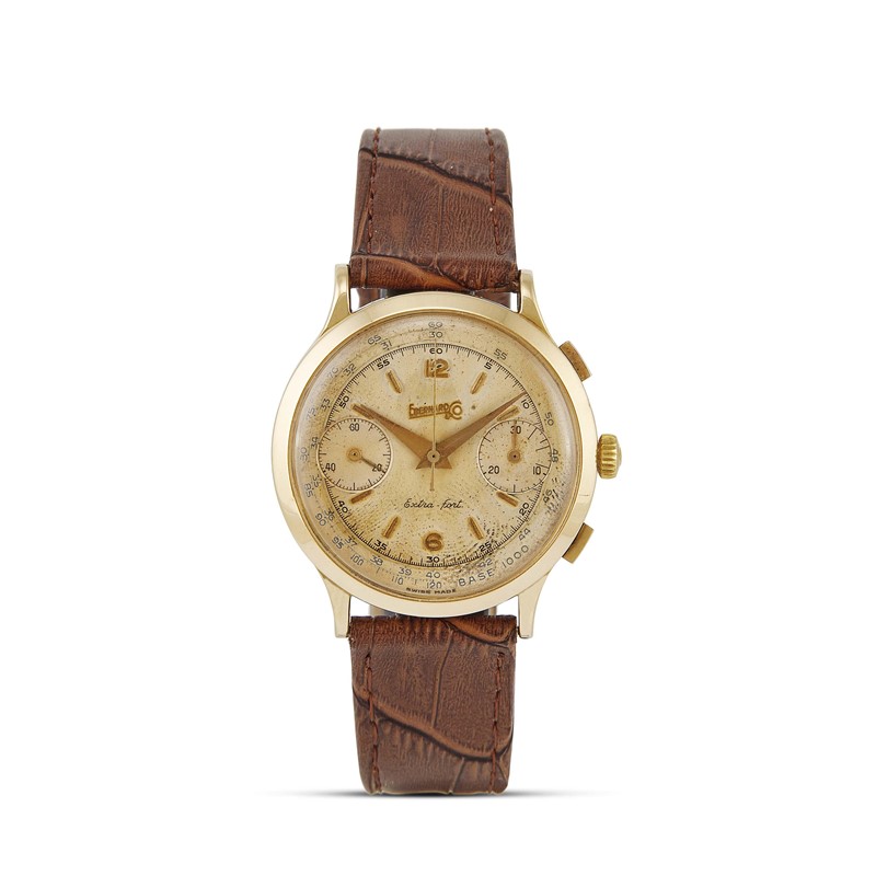 cassa in oro giallo 18kt, fondello a pressione, corona marcata, tasti crono di forma rettangolare, quadrante champagne firmato Eberhard & Co., contatore dei secondi a ore nove, contatore dei minuti a ore tre, numeri arabi e indici applicati color oro, movimento a carica manuale cal Valjoux 65, cinturino in pelle marrone, fibbia in metallo dorato, vetro plastica, gr. 51. Diam. mm 40