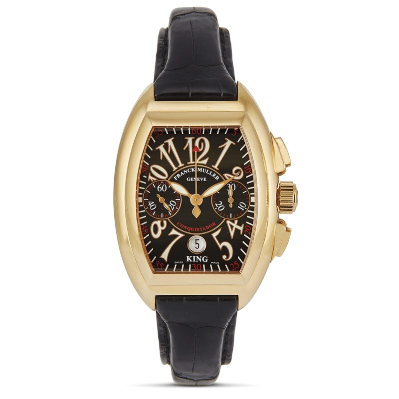 cassa di forma in oro giallo 18kt, fondello serrato con viti, ghiera a scalino in oro giallo 18kt, tasti del crono rettangolari, corona marcata, quadrante guilloché nero, grafica bianca, grandi numeri arabi al superluminova, contatore dei secondi a ore nove, contatore dei minuti a ore tre, datario a ore sei, movimento a carica automatica, cinturino originale in pelle nera, lungh. interna cm 21, chiusura deployant in oro giallo 18kt marcata Franck Muller, vetro minerale, gr. 211. Dim. mm 40x56