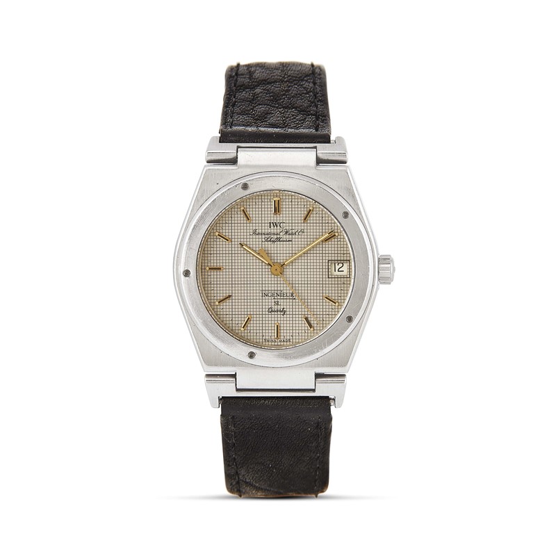 cassa in acciaio, fondello serrato a vite con coperchio antimagnetico, lunetta in acciaio con viti, corona marcata, quadrante grigio carta millimetrata, indici applicati, datario a ore tre, movimento al quarzo, cinturino in pelle nera, fibbia deployant in acciaio marcata IWC, vetro minerale. Diam. mm 34
