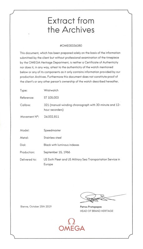 Questo raro esemplare, come riportato nell'estratto degli archivi Omega, è stato acquistato il 15 settembre del 1966 presso il Comando della Sesta Flotta U.S.A.