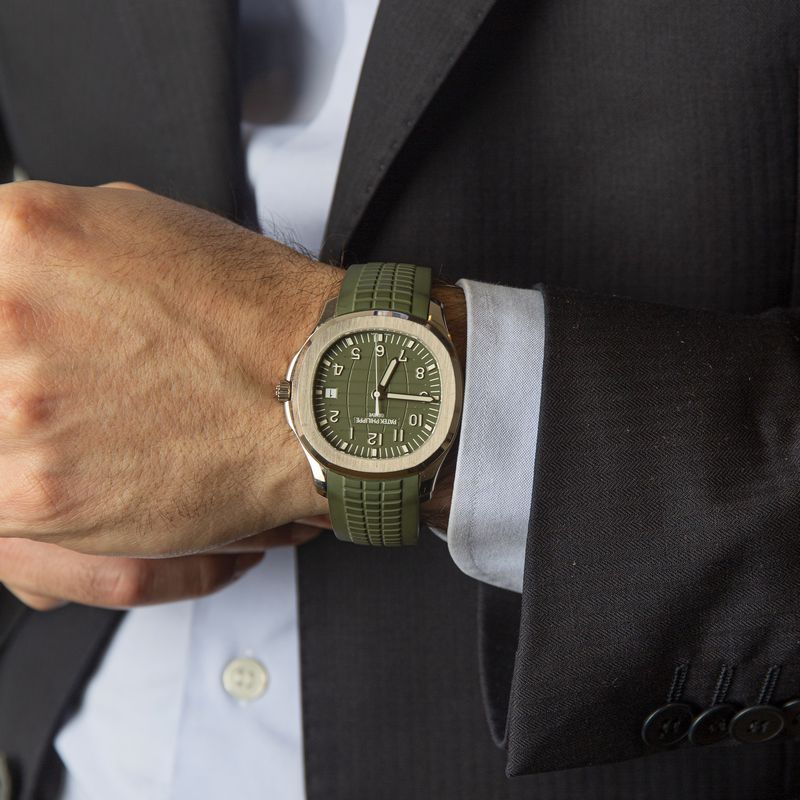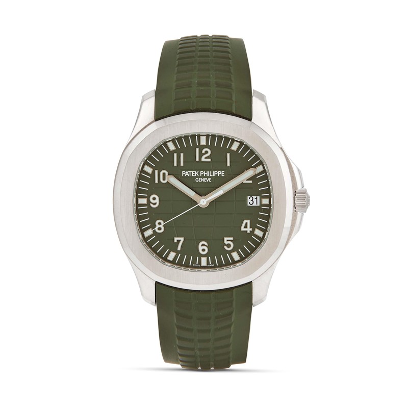 cassa monoblocco in oro bianco 18kt, fondello con movimento a vista, ghiera liscia in oro bianco 18kt, quadrante Grand Tapisserie di color kaki, grafica bianca, numeri arabi e indici applicati al superluminova, datario a ore tre, movimento a carica automatica cal 324 SC n. 7332232, cinturino in gomma kaki, lungh. interna cm 19, chiusura doppia deployant marcata Patek Philippe, vetro minerale, gr. 127. Diam. mm 42. Corredato di scatola e garanzia.