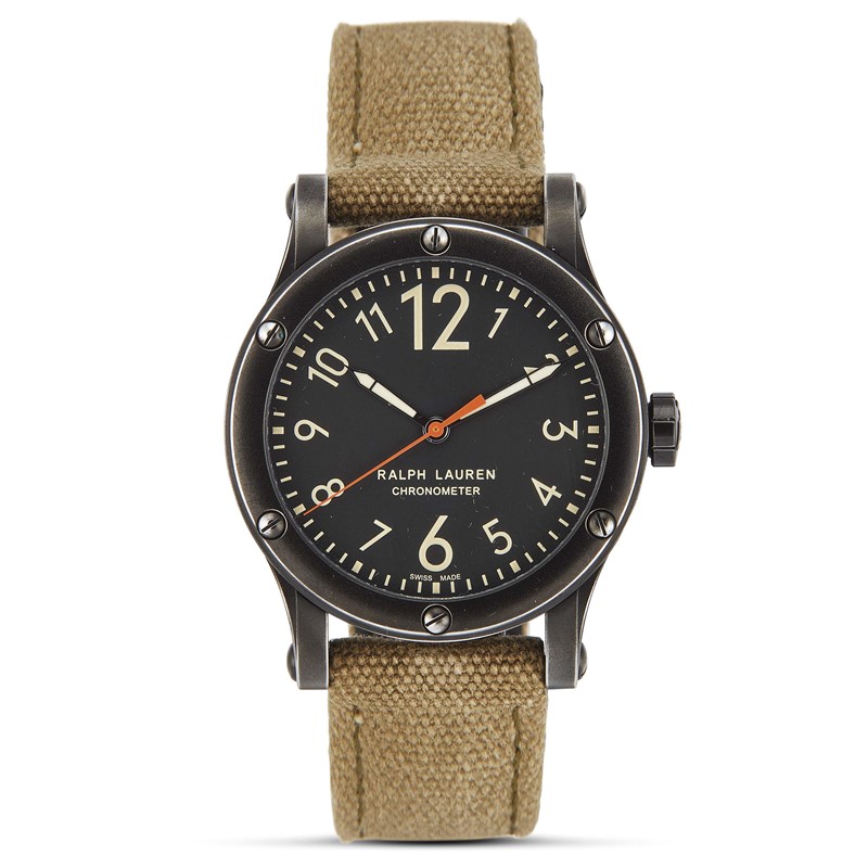 cassa in acciaio con trattamento nero, fondello serrato con viti, corona marcata, ghiera in acciaio nero con viti, quadrante nero, grafica bianca, numeri arabi al superluminova, movimento a carica automatica, cinturino in tessuto verde militare, fibbia in acciaio firmato Ralph Lauren, vetro minerale. Diam. mm 45