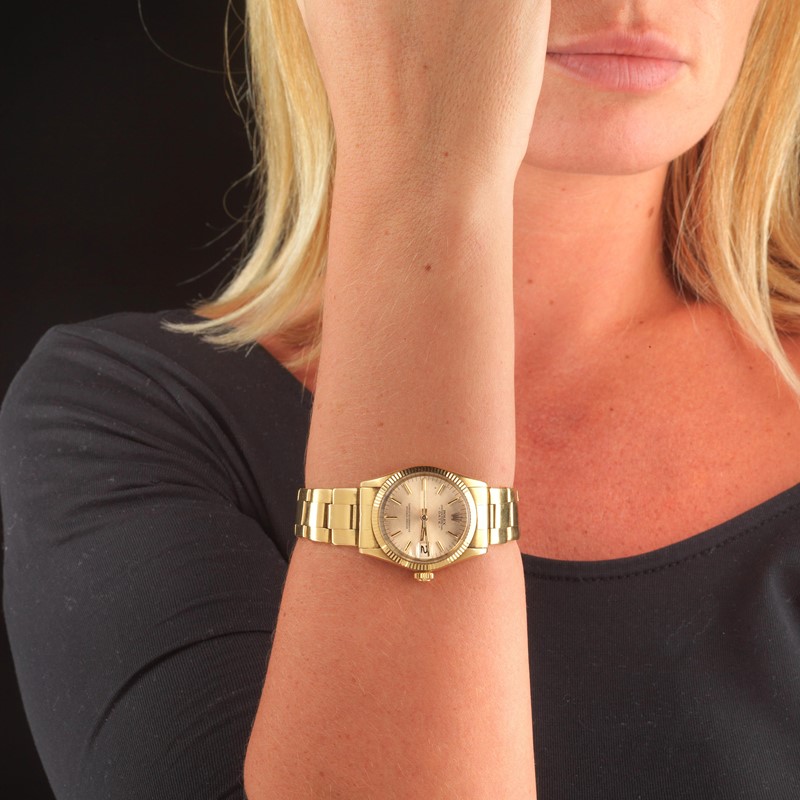 cassa in oro giallo 18kt, fondello serrato a vite, corona marcata, ghiera zigrinata in oro giallo 18kt, quadrante champagne, indici applicati con trizio, movimento a carica automatica cal 1161 n. 54722, bracciale e chiusura a scatoletta in oro giallo 18kt non originali, lungh. interna cm 19, vetro plastica, gr. 78. Diam. mm 31